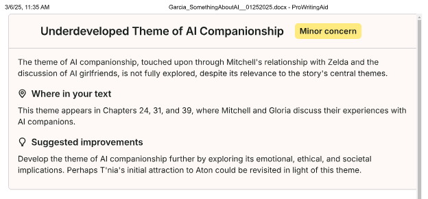 After I went through the .docx over and over and over again in Word I plugged it into a new tool I was trying: ProWritingAid (PWA). PWA is a Orpheus Technology product. Orpheus is all about AI.