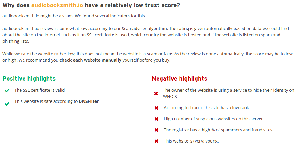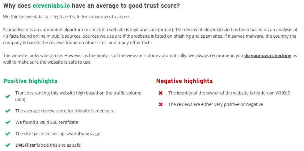 Before selecting a service use whois and scamadviser.com to check your potential service’s website. The latter will give results like this: