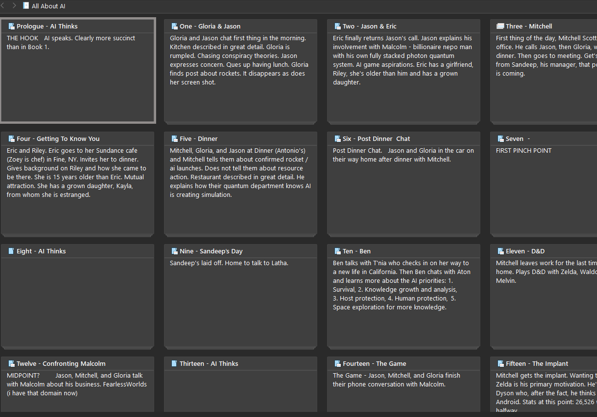 As I’ve been going through these two efforts in parallel I’ve made some dramatic cuts. Today I moved out of play more than 15,000 words, about 9 chapters. I use Scrivener so I created a new folder after Research and called it Old Stuff. I may want to pull pieces back in but for now they’re out. Scrivener also has this overview feature … it’s like having every chapter summarized on 3×5 cards and being able to see key info about each chapter at a glance. Here is what it looks like with the first fifteen chapter cards (before all my rework):